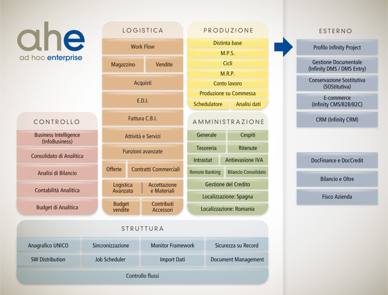 Il software gestionale AdHoc Enterprise è il risultato di un progetto unitario , suddivisibile nelle maggiori aree funzionali aziendali, tipiche per le piccole e medie aziende, nelle quali generalmente si ha un basso livello di specializzazione degli utenti, dove cioè si trovano pochi utenti che ricoprono tutte le attività aziendali.